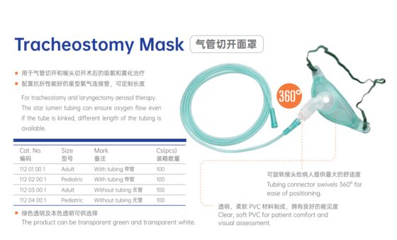 The Medical-Grade Tracheostomy Mask is designed specifically for patients with tracheostomies and laryngectomies who require effective and comfortable aerosol therapy. This mask is equipped with soft, breathable PVC material to ensure patient comfort while delivering consistent oxygen flow. Featuring a 360° swiveling connector, it allows for easy positioning, ensuring the mask stays secure even when the patient moves. The two types with tubing or without tubing options, this mask is versatile and tailored to meet diverse patient needs. The transparent green PVC material also provides excellent visual assessment of the patient's condition.